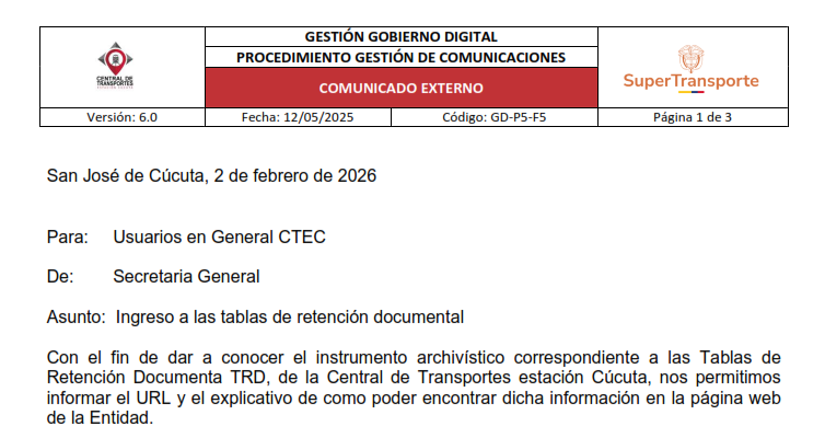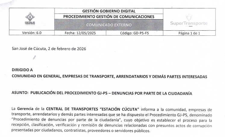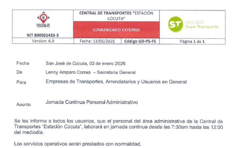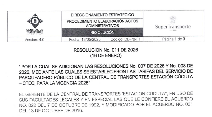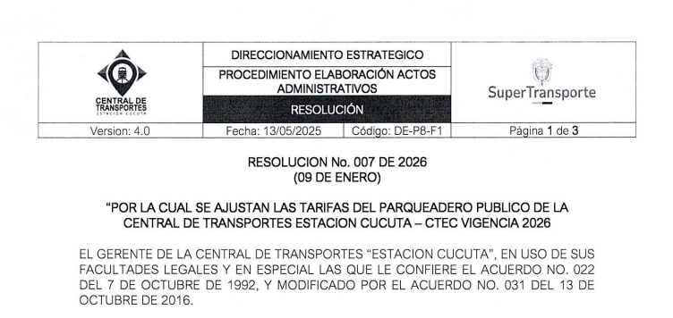 Leer másAJUSTE DE TARIFAS DEL PARQUEQADERO PUBLICO DE LA CENTRAL DE TRANSPORTE ESTACION CUCUTA – VIGENCIA 2026