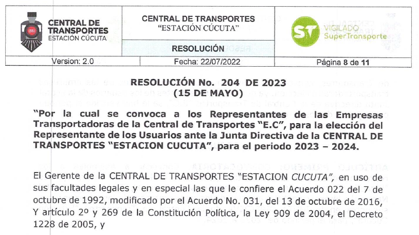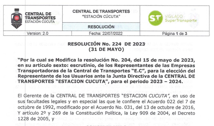 Escrutinio de los representantes de las empresas transportadoras de la Central de Transportes «E.C.» para la elección del representante de los usuarios ante la Junta Directiva de la Central de Transportes «Estación Cúcuta» Ver documento… Resolución 224 31 de mayo de 2023, por la cual se modifica la Resolución 204 del 15 de mayo de 2023