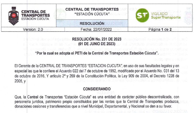 Resolución 231 de 2023 – Por la cual se adopta el PETI de la Central de Transportes «Estación Cúcuta»