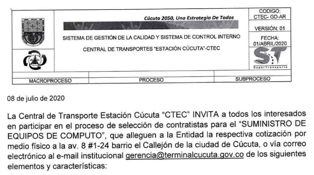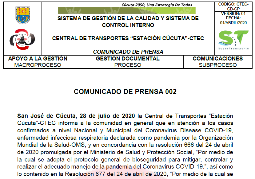 San José de Cúcuta, 28 de julio de 2020 la Central de Transportes “Estación Cúcuta”-CTEC informa a la comunidad en general que en atención a los casos confirmados a nivel Nacional y Municipal del Coronavirus… Comunicado de Prensa 002